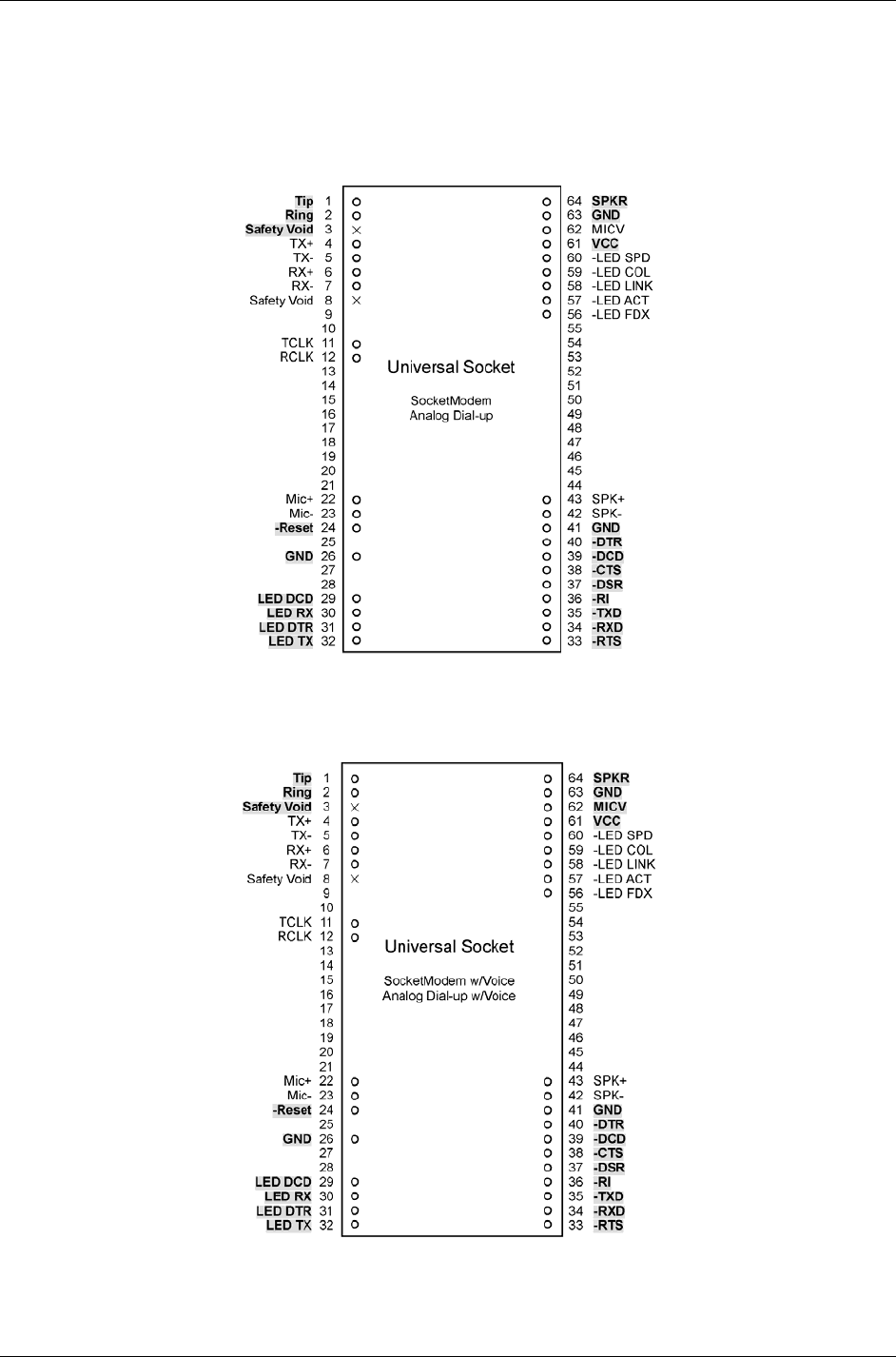 Note: The bolded, shaded pins are the active SocketModem pins.