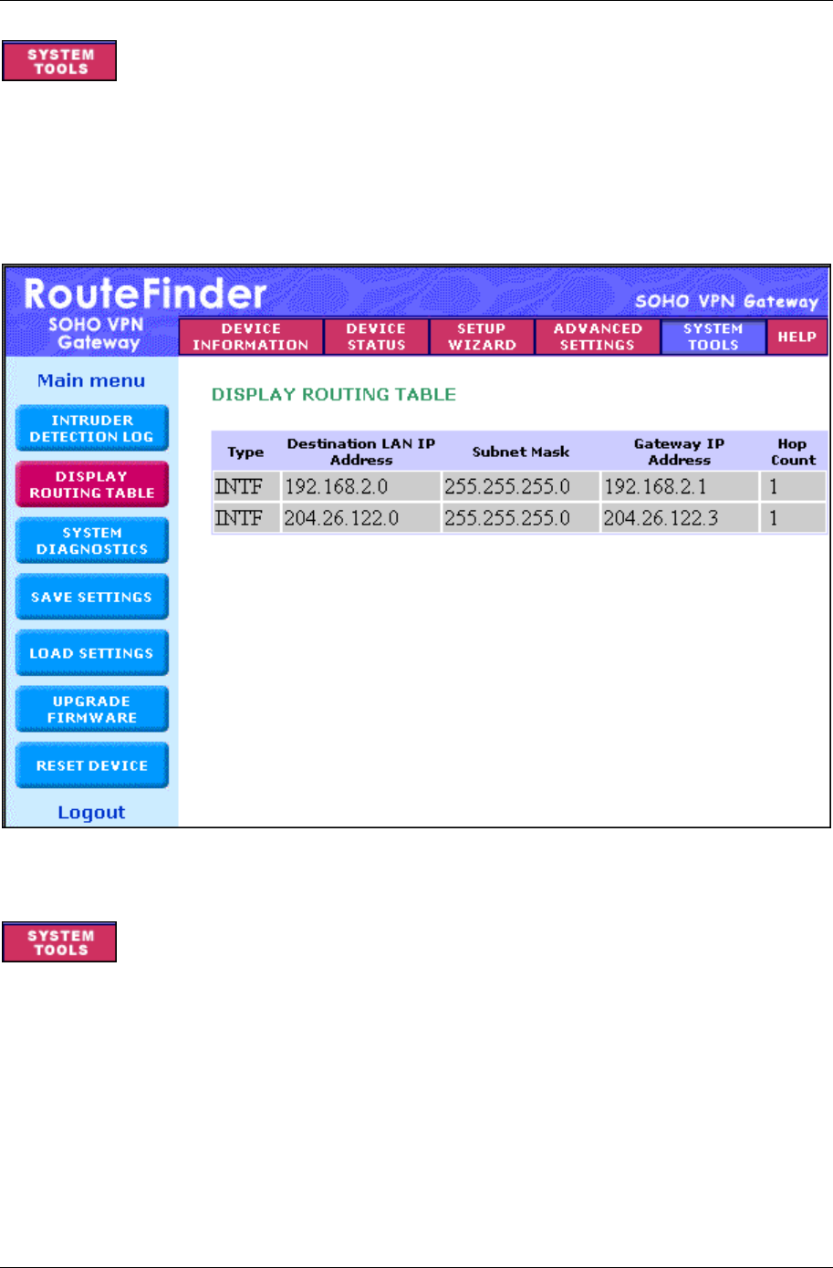 To access this screen, click the Display Routing Table button from the System Tools screen. The
